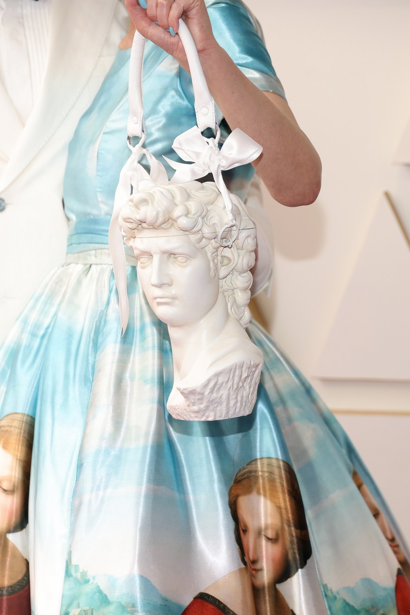 وارتدت الميكاب أرتست ومصممة الشعر “إيفا”، البالغة من العمر 53 عامًا، فستانًا مذهلًا يضم لوحة من عصر النهضة من رافائيل، وأكملت إيفا إطلالتها بحقيبة تمثال نصفي للحفل.