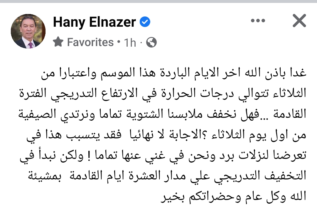 هاني الناظر: اليوم آخر الأيام الباردة.. وأحذر من تخفيف الملابس لهذا السبب