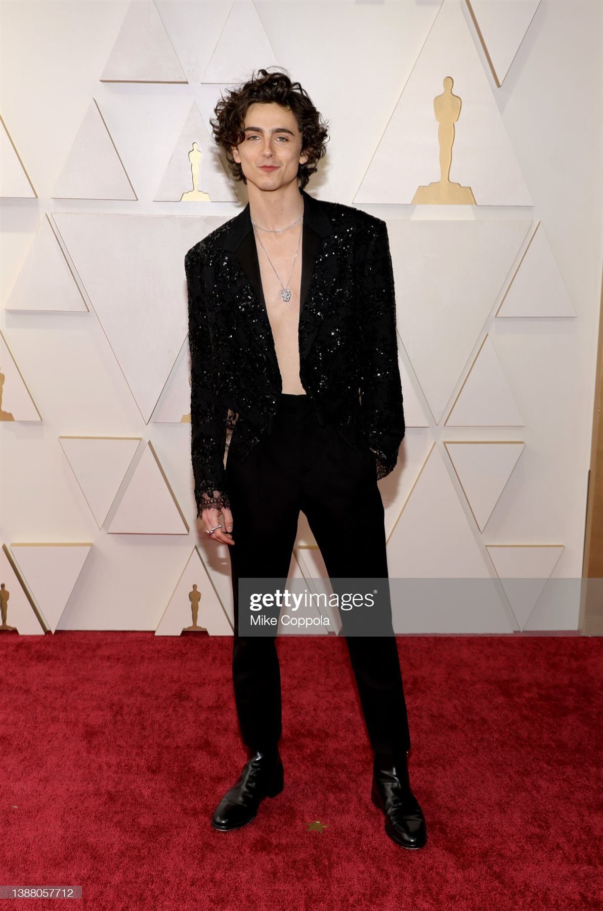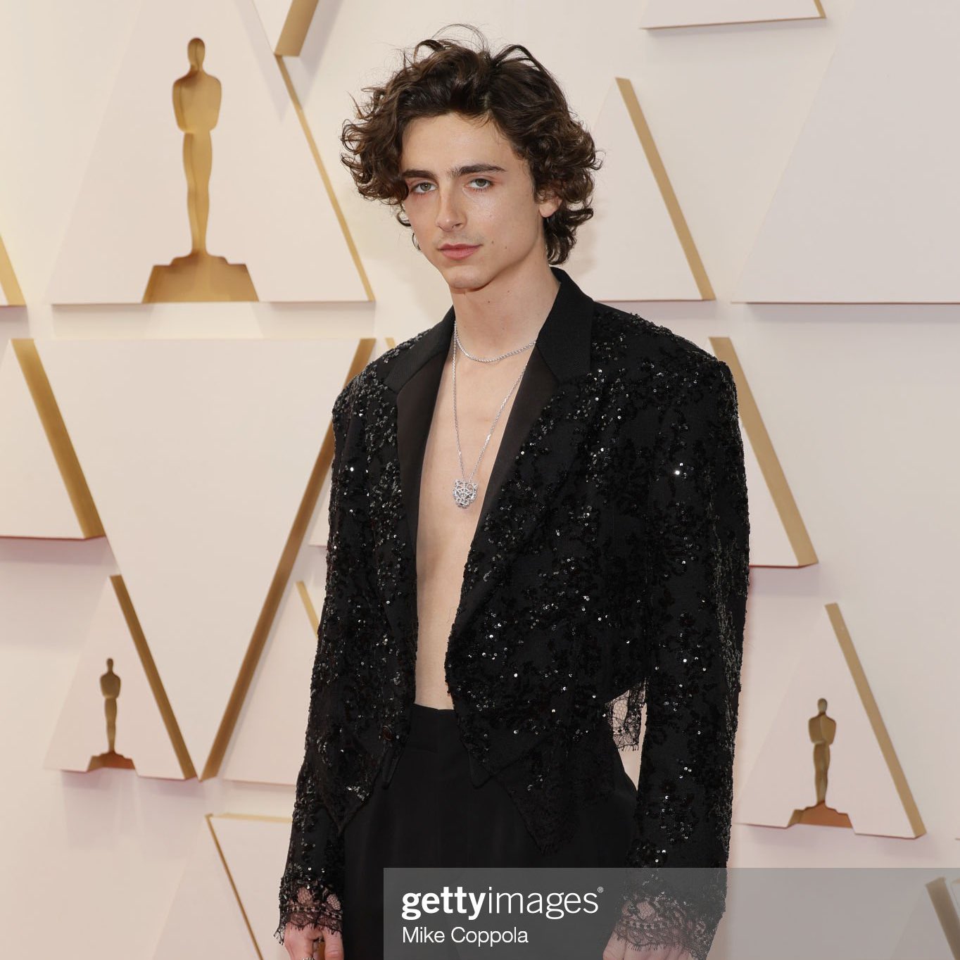وصل تيموثي شالاميت نجم فيلم Dune، المرشح للفوز بأفضل فيلم خلال حفل جوائز الأوسكار 2022، إلى مقر الحفل، ولفت النجم الشاب الأنظار له بارتدائه بدله سوداء مطرزة وبدون قميص، واختار أن يزينها عبر قلادة ماسية حول عنقه.