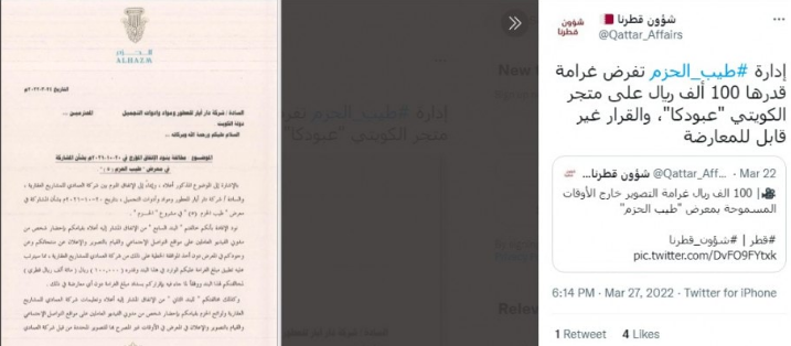 إلا أن المشهور الكويتي عاد ونشر خطابًا منسوبًا لإدارة المعرض وموجَها إلى شركة (دار أيار للعطور ومواد وأدوات التجميل) الكويتية، يفيد بتغريمها 100 ألف ريال قطري (27.6 ألف دولار) لمخالفتها الاتفاق المبرم بشأن المشاركة في المعرض.