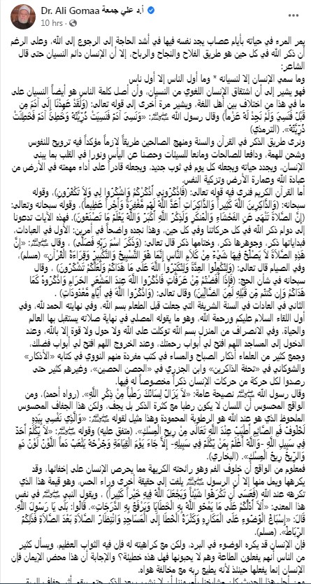 وكتب علي جمعة تدوينة على الفيس بوك "يمر المرء في حياته بأيام عصاب يجد نفسه فيها في أشد الحاجة إلى الرجوع إلى الله، وعلى الرغم أن ذكر الله في كل حين هو طريق الفلاح والنجاح والرباح، إلا أن الإنسان دائم النسيان حتى قال الشاعر: وما سمي الإنسان إلا لنسيانه * وما أول الناس إلا أول ناس".