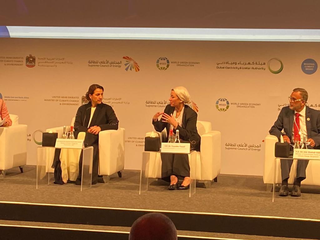 شاركت اليوم الدكتورة ياسمين فؤاد وزيرة البيئة المنسق الوزارى ومبعوث مؤتمر الأطراف الـ27 للتغيرات المناخية اليوم فى الحلقة النقاشية الافتتاحية رفيعة المستوى حول رفع مستوى الطموح فى أسبوع المناخ للشرق الأوسط وشمال إفريقيا، الذي يعقد خلال الفترة من ٢٧ إلى ٣١ مارس الجاري بدبي بدولة الإمارات العربية المتحدة.
