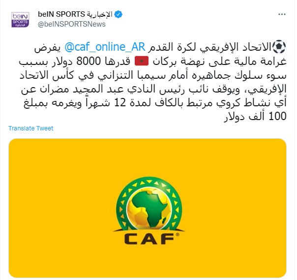 وكتب موقع "beinsports" تغريدة على تويتر "الاتحاد الإفريقي لكرة القدم @caf_online_AR يفرض غرامة مالية على نهضة بركان قدرها 8000 دولار بسبب سوء سلوك جماهيره أمام سيمبا التنزاني في كأس الاتحاد الإفريقي، ويوقف نائب رئيس النادي عبد المجيد مضران عن أي نشاط كروي مرتبط بالكاف لمدة 12 شهرًا ويغرمه بمبلغ 100 ألف دولار"