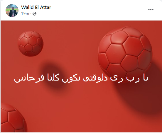 نشر وليد العطار المدير التنفيذي لاتحاد الكرة المصري، رسالة عبر حسابه الشخصي على موقع التواصل الإجتماعي فيسبوك، تدوينة تضمنت دعوة للشعب المصري بالفرحة غدا بتأهل منتخب مصر لنهائيات كأس العالم 2022 بقطر، بتخطي منتخب السنغال.