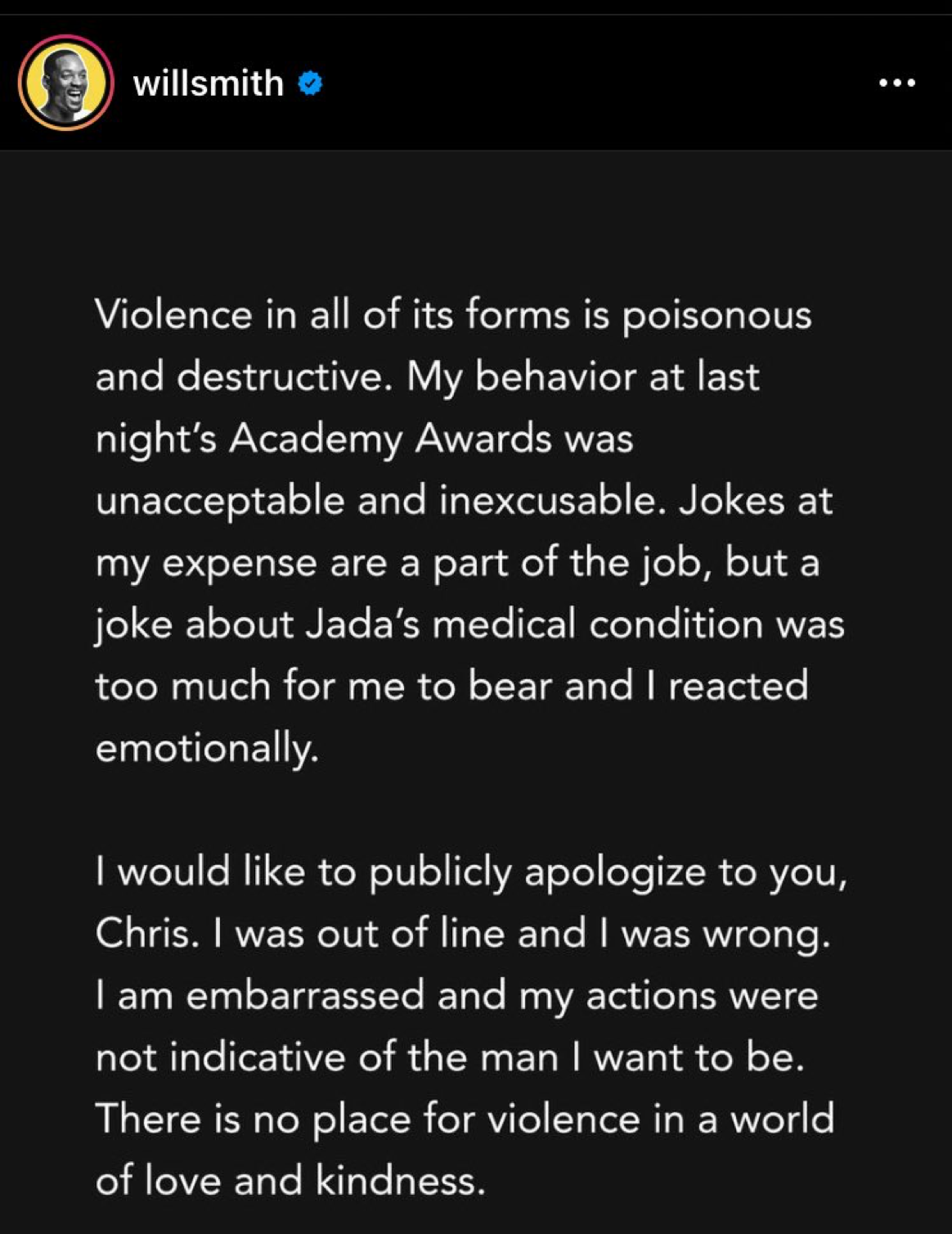 وجه الممثل ويل سميث اعتذارا لزميله كريس روك علي واقعة صفعه له في حفل الأوسكار، وذلك عبر حسابه الرسمي علي موقع الصور والفيديوهات إنستجرام قائلا:"أود أن أعتذر لك علنًا يا كريس…تعديت حدودي وكنت مخطئًا.. أنا محرج وأفعالي لم تكن مؤشرًا على الرجل الذي أريد أن أكونه".