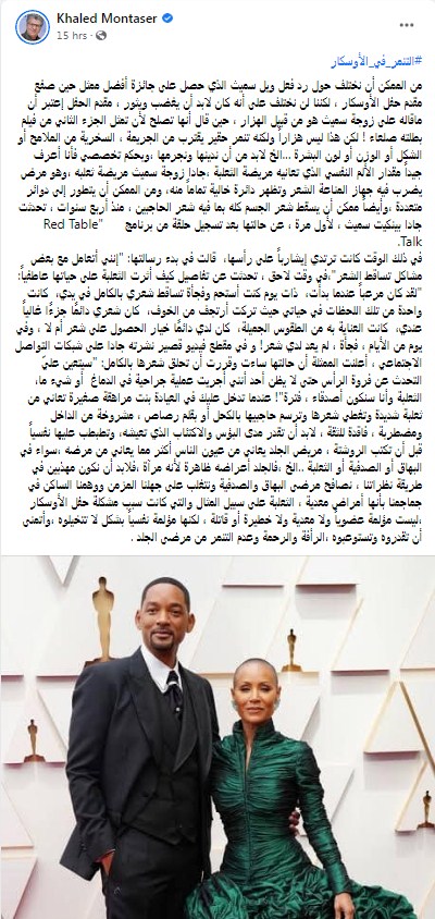 وعن تأثير مرض الثعلبة على زوجة ويل سميث قال منتصر: "في ذلك الوقت كانت ترتدي إيشاربًا على رأسها، قالت في بدء رسالتها: "إنني أتعامل مع بعض مشاكل تساقط الشعر"، في وقت لاحق، تحدثت عن تفاصيل كيف أثرت الثعلبة على حياتها عاطفيًا: "لقد كان مرعبًا عندما بدأت، ذات يوم كنت استحم وفجأة تساقط شعري بالكامل في يدي، كانت واحدة من تلك اللحظات في حياتي، حيث تركت أرتجف من الخوف، كان شعري دائمًا جزءًا غاليًا عندي، كانت العناية به من الطقوس الجميلة، كان لدي دائمًا خيار الحصول على شعر أم لا، وفي يوم من الأيام، فجأة لم يعد لدي شعر!"