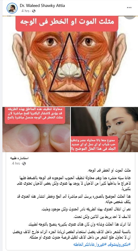 وكتب الدكتور وليد شوقي تدوينة على الفيس بوك "مثلث الموت او الخطر فى الوجه.. عادة سيئه منشره جدا وهى محاولة تنظيف الحبوب الموجوده فى الوجه بالضغط عليها لاخراج ما بداخلها كثيرا من الاحيان لا يوجد بها عدوى ولكن بعض الاحيان تحتوى على بكتيريا."