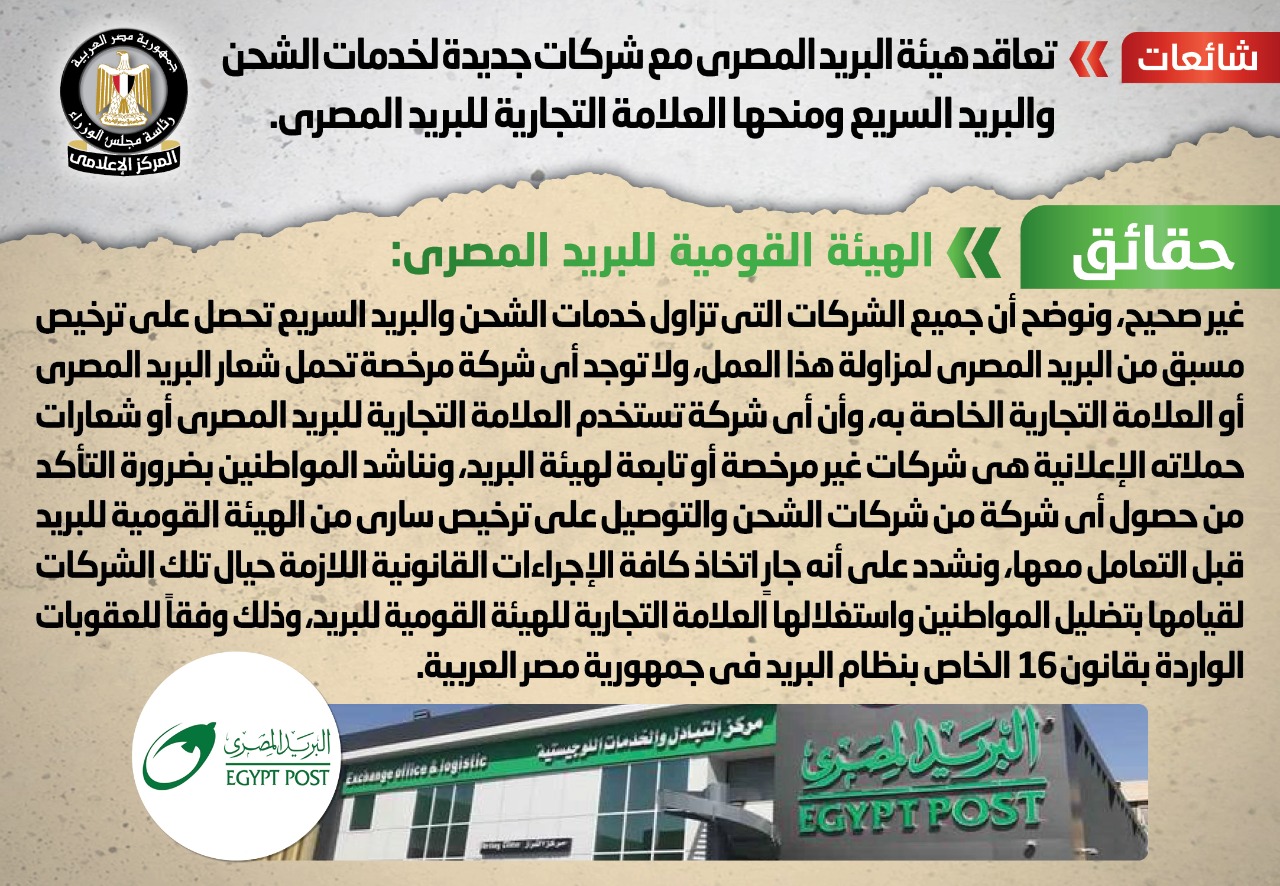 من جانبه تواصل المركز الإعلامي لمجلس الوزراء مع الهيئة القومية للبريد المصري، والتي نفت تلك الأنباء، مُؤكدةً أنه لا صحة لتعاقد هيئة البريد المصري مع شركات جديدة لخدمات الشحن والبريد السريع ومنحها العلامة التجارية للبريد المصري.