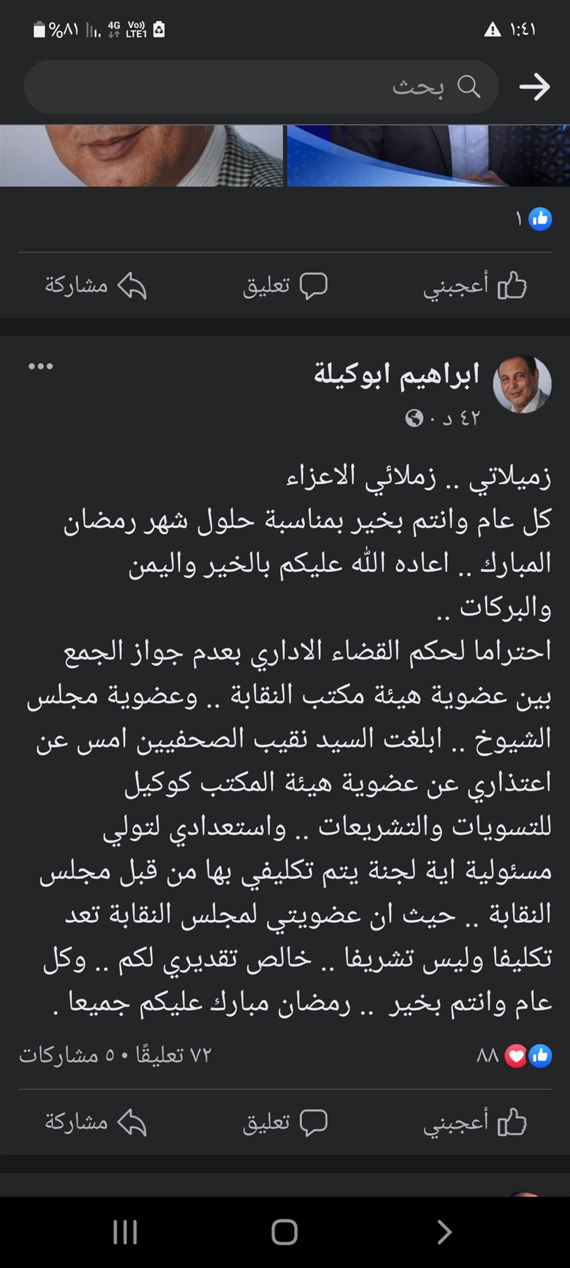 واستعدادي لتولي مسئولية أية لجنة يتم تكليفي بها من قبل مجلس النقابة حيث أن عضويتي لمجلس النقابة تعد تكليفا وليس تشريفا خالص تقديري لكم وكل عام وانتم بخير رمضان مبارك عليكم جميعا.
