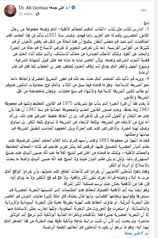 وكتب الدكتور علي جمعة تدوينة على الفيس بوك للوقوف على النموذج المصري فقال: "الدارس لكتاب مثل كتاب «الكتاب الذهبي للمحاكم الأهلية» الذي وضعه مجموعة من رجال القانون المصريين وقدم له عبد العزيز باشا فهمي، وصدر سنة 1933م يتأكد من هذا المعنى، ففي المناقشات التي تمت في مجلس النظار يتضح أن هذه الحالة من النقل في بعض الأحيان أو في كثيرها من القوانين الفرنسية، إنما كان لغرض التطوير لا لغرض الانسلاخ في حالة من الحيرة والبحث عن القوة".
