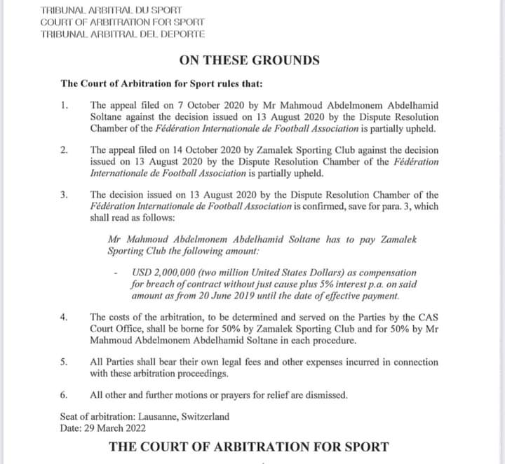 وجاء ذلك بعد أن أصدرت المحكمة الرياضة "كاس" في لوزان بسويسرا حكمًا نهائيًا غير قابل للطعن بتغريم محمود عبد المنعم كهربا مبلغ وقدره 2 مليون دولار بالإضافة إلى 5% فوائد على المبلغ اعتبارا من يوم 20 يونيو 2019 وحتى تاريخ السداد الكامل لمبلغ الغرامة.