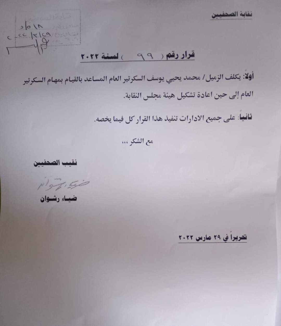 أصدر ضياء رشوان نقيب الصحفيين قرارا بتكليف محمد يحيى يوسف السكرتير العام المساعد بنقابة الصحفيين القيام بمهام السكرتير العام للنقابة الى حين إعادة تشكيل هيئة مجلس النقابة.