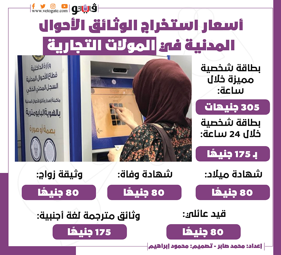 أسعار استخراج الوثائق الأحوال المدنية في المولات التجارية | إنفوجراف الثلاثاء 29/مارس/2022 - 06:35 م 3/29/2022 6:35:01 PM أسعار استخراج وثائق محمد صابر شارك طباعة 18 حجم الخط شارك طباعة المولات التجارية بطاقة شخصية وثائق الأحوال المدنية استخراج الوثائق استخراج شهادة ميلاد الاحوال المدنية استخراج شهادة وفاة