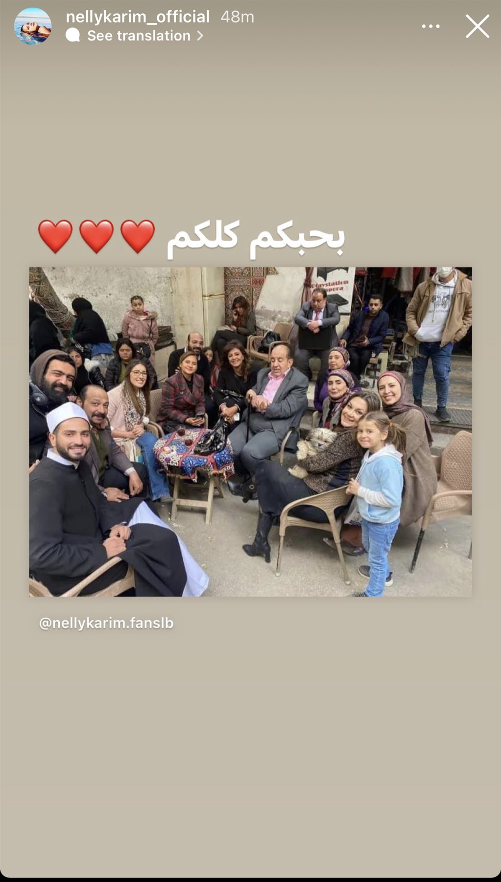 نشرت الممثلة نيللي كريم صورة لأبطال مسلسلها الرمضاني الجديد فاتن أمل حربي عبر حسابها الرسمي على موقع الصور والفيديوهات “انستجرام”، وعلقت نيللي على الصورة قائلة: "بحبكم كلكم".