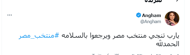 علقت المطربة أنغام على نتيجة مباراة مصر والسنغال وعدم تأهل الفراعنة قائلة عبر صفحتها على تويتر :" يارب تنجي منتخب مصر ويرجعوا بالسلامة الحمدلله ".