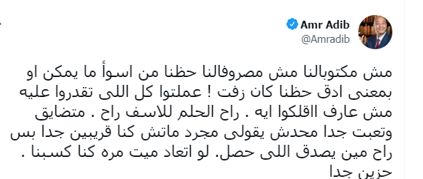 وكتب عمرو أديب عبر حسابه الرسمي بموقع التغريدات القصيرة توتير: مش مكتوبالنا مش مصروفالنا حظنا من أسوأ ما يمكن أو بمعنى أدق حظنا كان زفت! عملتوا كل اللى تقدروا عليه مش عارف اقولكوا إيه.. راح الحلم للأسف راح.. متضايق وتعبت جدا محدش يقولى مجرد ماتش كنا قريبين جدا بس راح مين يصدق اللى حصل.. لو اتعاد ميت مرة كنا كسبنا.. حزين جدا.