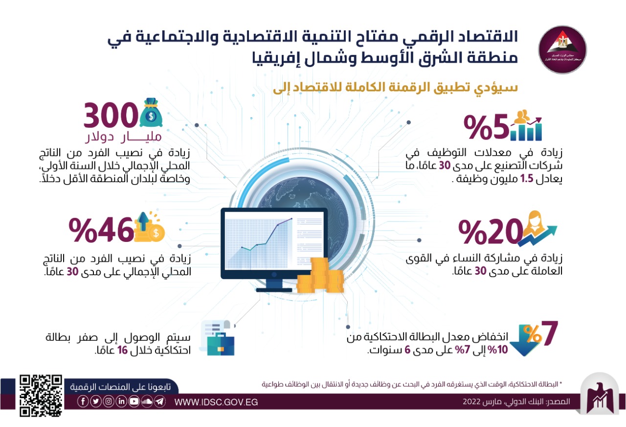 نشر مركز المعلومات ودعم اتخاذ القرار إنفوجرافا يتناول أهمية تطبيق التحول الرقمي في دول منطقة الشرق الأوسط وشمال إفريقيا؛ حيث سيؤدي تطبيق الرقمنة الكاملة للاقتصاد إلى زيادة 46% في نصيب الفرد من الناتج المحلي الإجمالي.