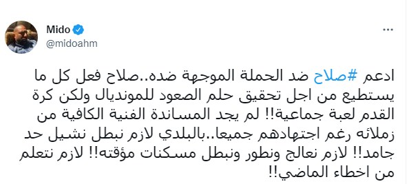وكتب أحمد حسام "ميدو" تغريدة على تويتر "ادعم #صلاح ضد الحملة الموجهة ضده..صلاح فعل كل ما يستطيع من أجل تحقيق حلم الصعود للمونديال ولكن كرة القدم لعبة جماعية!! لم يجد المساندة الفنية الكافية من زملائه رغم اجتهادهم جميعا.. بالبلدي لازم نبطل نشيل حد جامد!! لازم نعالج ونطور ونبطل مسكنات مؤقتة!! لازم نتعلم من أخطاء الماضي!".