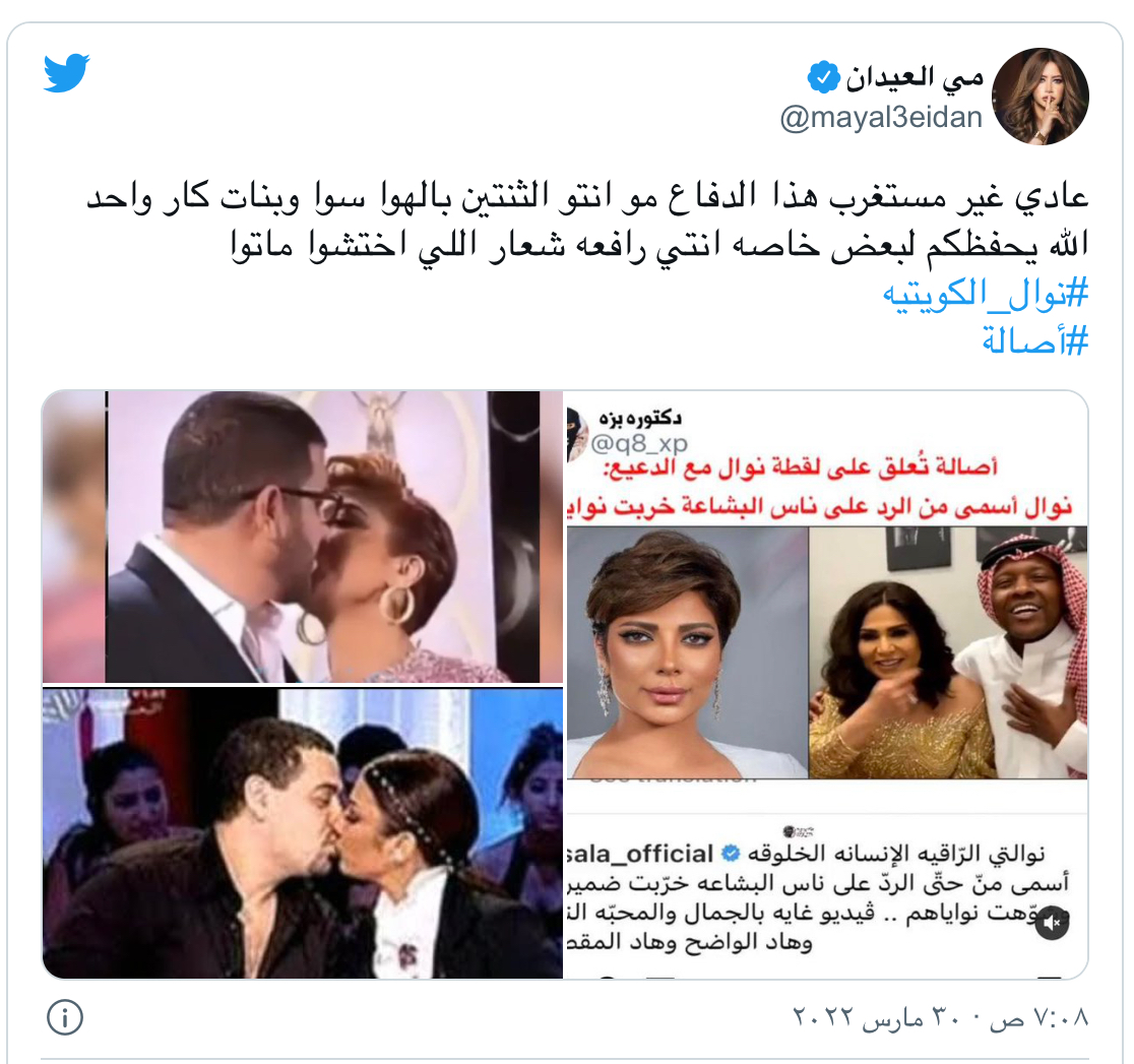 شنت الإعلامية الكويتية مي العيدان هجومًا على الفنانة السورية أصالة نصري، إثر دفاع الأخيرة عن الفنانة نوال الكويتية، عقب الانتقادات والهجوم الذي تعرضت له مؤخرًا بسبب الفيديو الذي ظهرت فيه برفقة محمد الدعيع، حارس مرمى الهلال والمنتخب السعودي الأسبق.