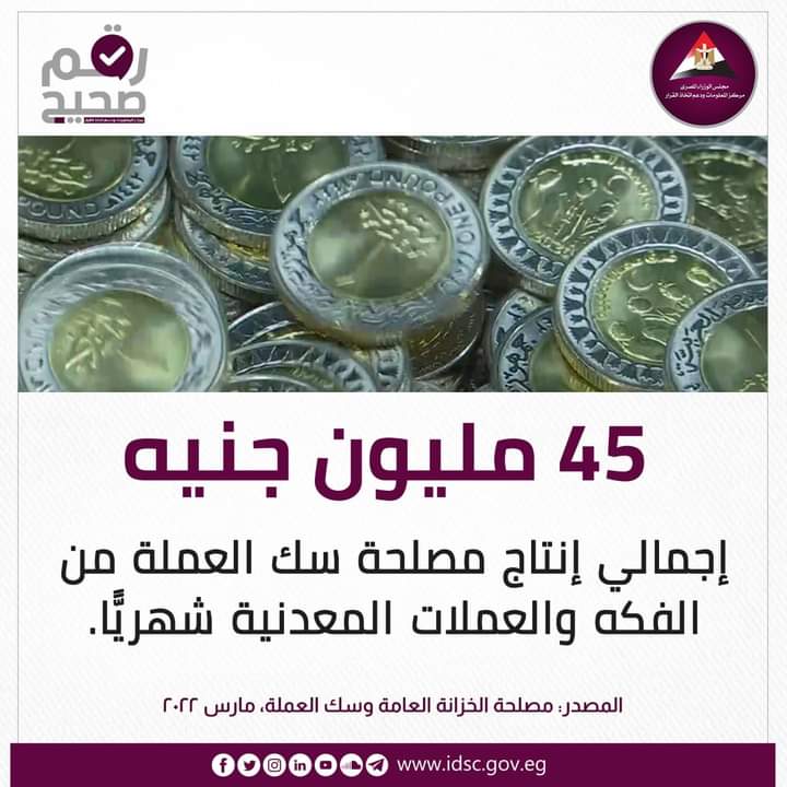 نشر مركز المعلومات ودعم اتخاذ القرار بمجلس الوزراء عبر صفحته الرسمية على موقع التواصل الاجتماعي فيسبوك، إنفوجراف بشأن احتياطي العملات المعدنية "الفكة".