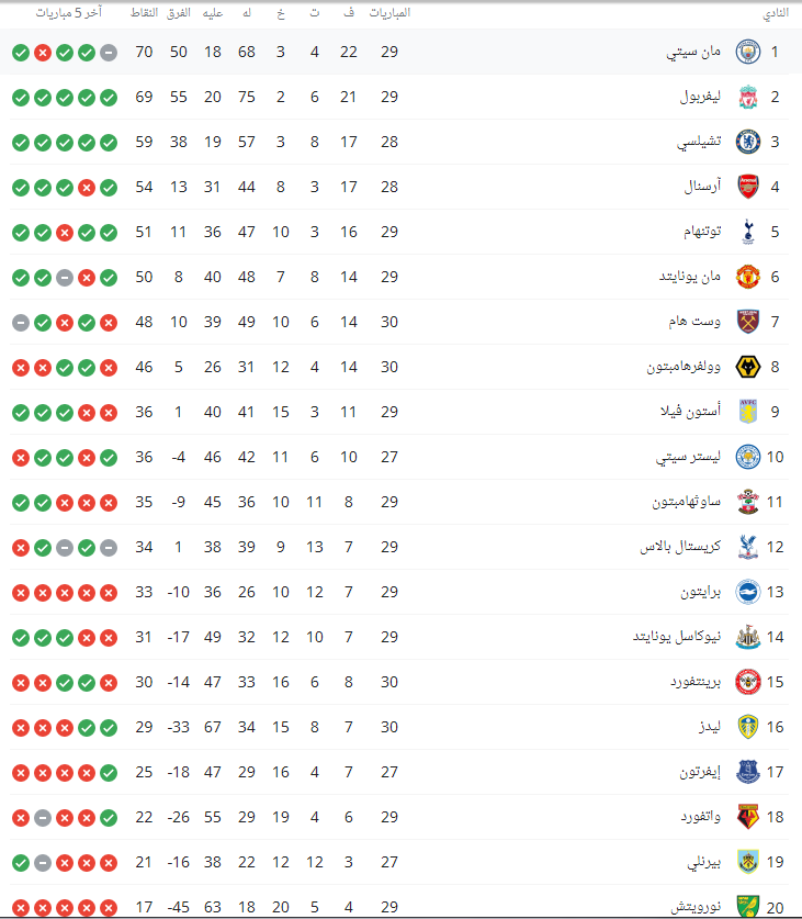 يأتي في صدارة ترتيب الدوري الإنجليزي الممتاز نادي مانشستر سيتي بقيادة مدربه جوارديولا برصيد 70 نقطة من 29 مباراة، ويلاحقه الوصيف نادي ليفربول بقيادة يورجن كلوب ب69 نقطة من 29 مباراة، بينما يأتي ثالثا نادي تشيلسي الإنجليزي بقيادة مدربه توخيل برصيد 59 نقطة من 28 مباراة.