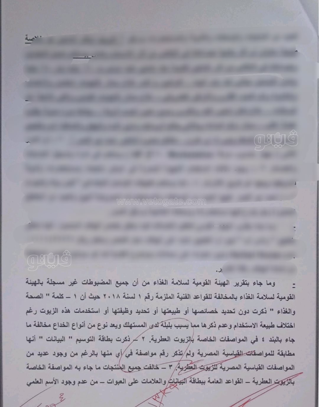 ٣- خالفت جميع المنتجات ما جاء به المواصفات الخاصة بالزيوت العطرية - القواعد العامة ببطاقات البيانات والعلامات علي العبوات - من عدم وجود الاسم العلمي "اللاتيني"، طريقة التصنيع أو معاملة خاصة، النسبة المئوية للمكون الرئيسي، الرموز ودلائل المخاطر المتعلقة بالمادة، شروط الحفظ، رقم التسجيلة ويعد مخالفة للقانون رقم ١٠ لسنة ١٩٦٦ الخاص بمراقبة الأغذية وتنظيم تداولها حيث إن الشركة لم تذكر تركيب واستخدام وطرق تصنيع المنتج مما يؤدي حتما إلى خداع المستهلك والإضرار الصحي به.