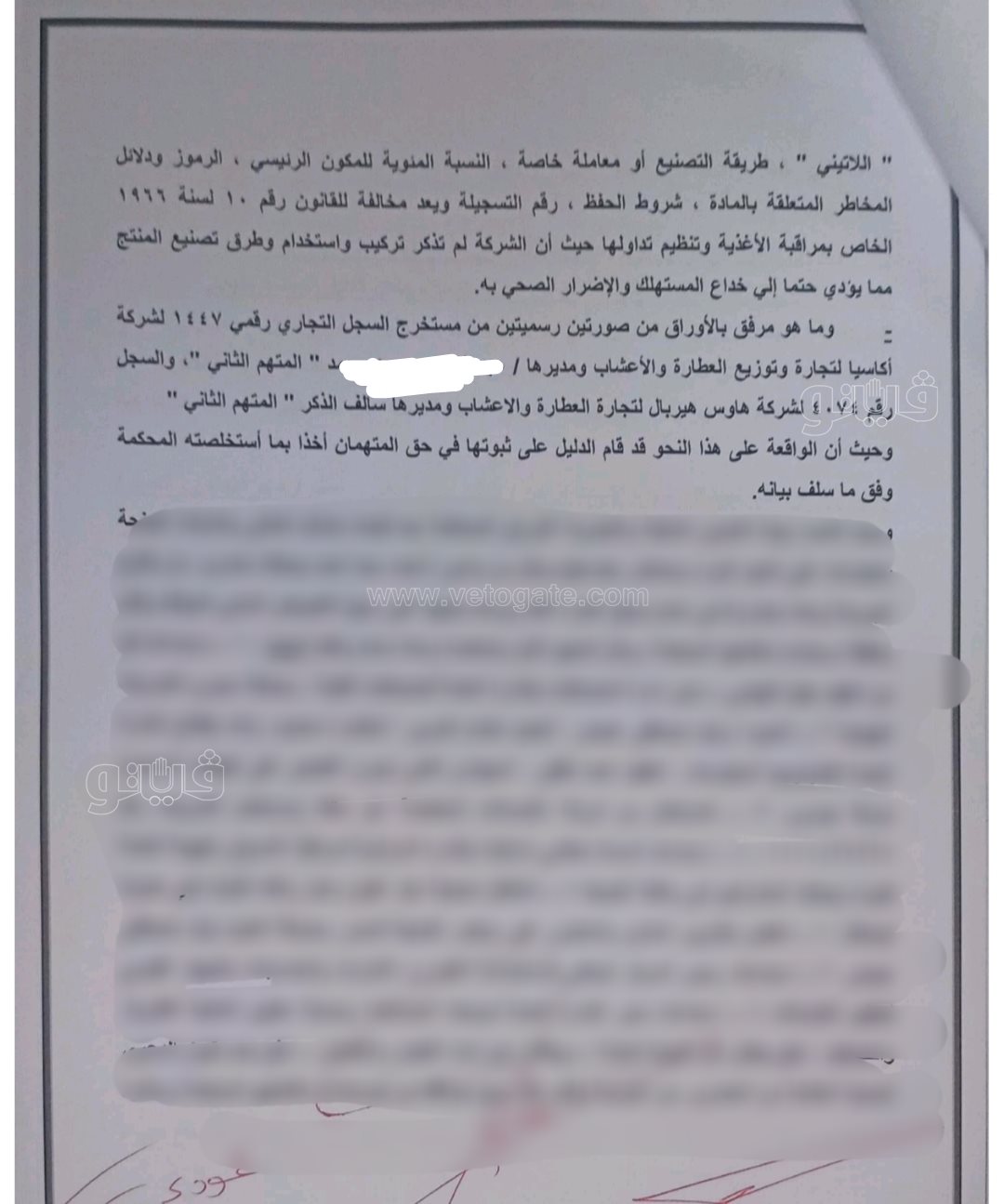 وجاء في الحيثيات التي تنفرد «فيتو» بنشر صورة منها، تقرير الهيئة القومية لسلامة الغذاء، من أن جميع المضبوطات غير مسجلة بالهيئة القومية لسلامة الغذاء بالمخالفة للقواعد الفنية الملزمة رقم ١ لسنة ٢٠١٨ حيث إن: