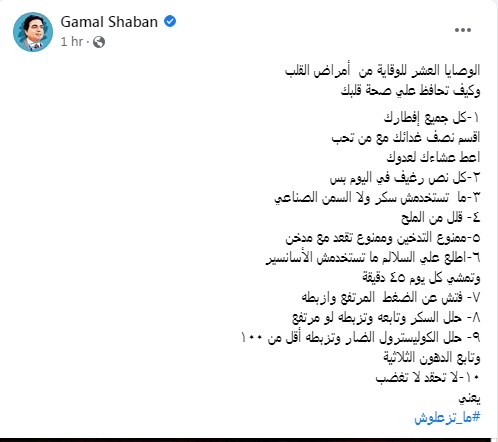 وكتب جمال شعبان تدوينة على الفيس بوك: "الوصايا العشر للوقاية من أمراض القلب.. وكيف تحافظ علي صحة قلبك ١-كل جميع إفطارك اقسم نصف غدائك مع من تحب اعط عشاءك لعدوك.. ٢-كل نص رغيف في اليوم بس ٣-ما تستخدمش سكر ولا السمن الصناعي.. ٤- قلل من الملح"