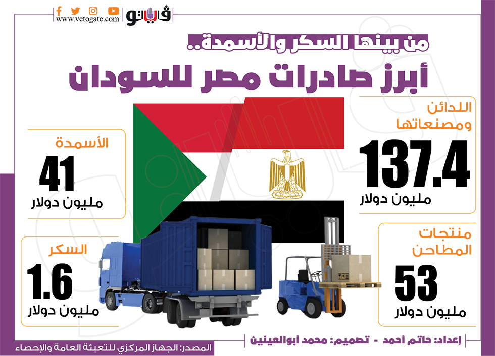 من بينها السكر والأسمدة.. أبرز صادرات مصر للسودان | انفوجراف الجمعة 01/أبريل/2022 - 09:15 م 4/1/2022 9:15:33 PM الصادرات المصرية حاتم أحمد شارك طباعة 18 حجم الخط شارك طباعة السودان الصادرات المصرية للسودان الجهاز المركزى للتعبئة العامة والإحصاء السكر الأسمدة