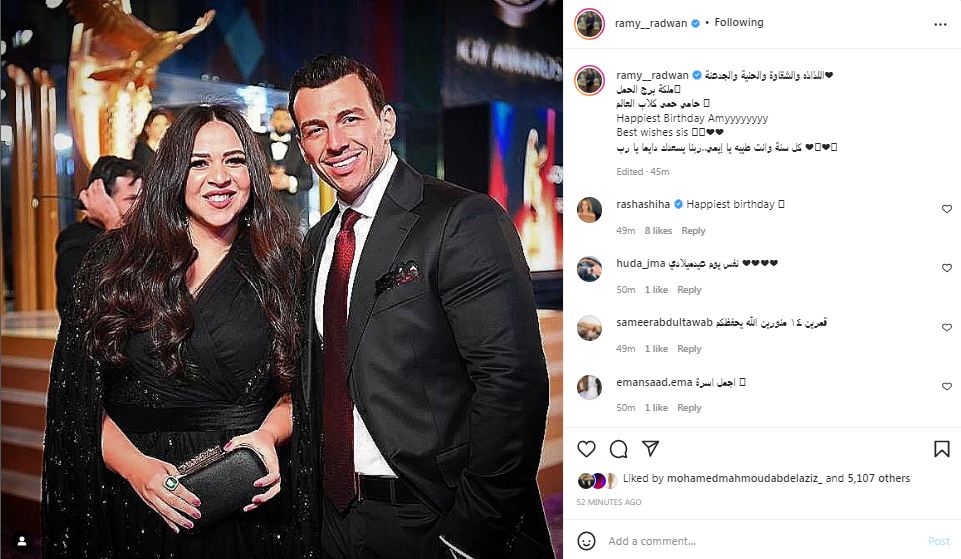 و احتفل الإعلامي رامي رضوان والفنانة دنيا سمير غانم بعيد ميلاد شقيقتها إيمي، وذلك من خلال خاصية القصص القصيرة علي حسابها بموقع انستجرام.. حيث نشرت دنيا صورة إيمي وعلقت عليها بـ " أطيب وأحن وأجمد كوميديانة في الدنيا".. وعلق رامي بـ: الفنانة والأخت الجدعة".