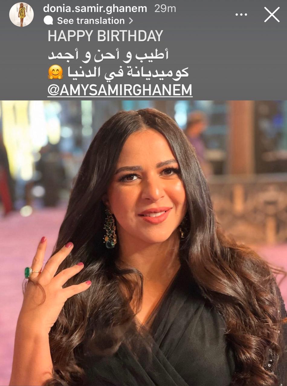 ونشرت الفنانة الشابة ليلى زاهر صورة لإيمي سمير غانم عبر حسابها الشخصي وخاصية «استوري» بموقع «انستجرام»، وعلقت عليها: «كل سنة وأنتِ طيبة يا صاحبة الروح الجميلة.. بحبك جدا».