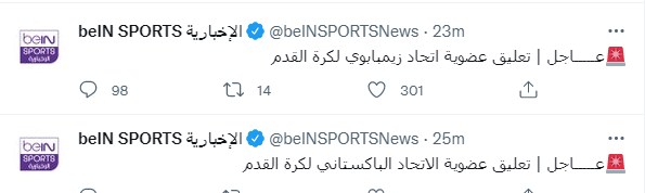 أكد موقع "bein sports" الإخبارية الرياضية، عبر حسابها الرسمي على تويتر أن الاتحاد الدولي لكرة القدم "فيفا" علق عضويتي الاتحاد الكيني لكرة القدم. والاتحاد الباكستاني لكرة القدم.