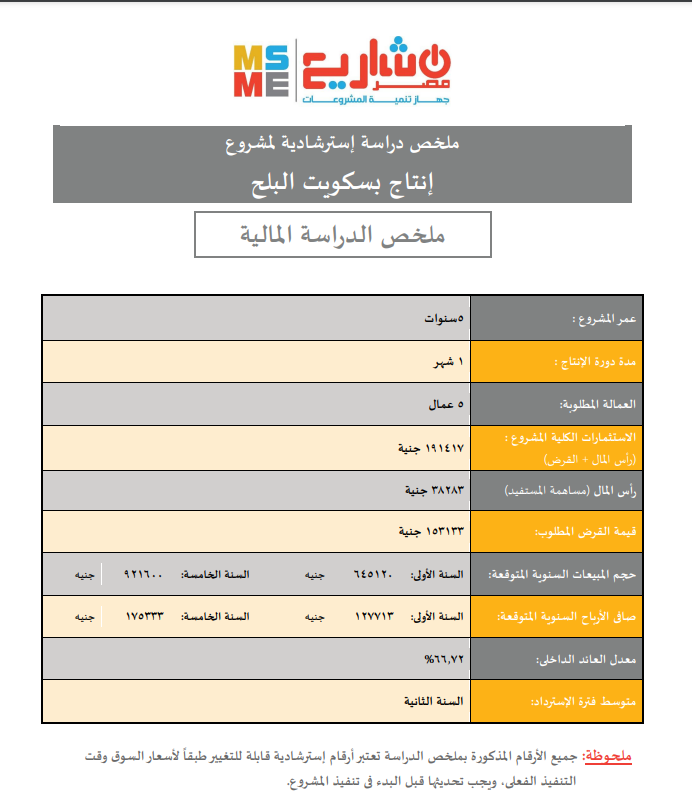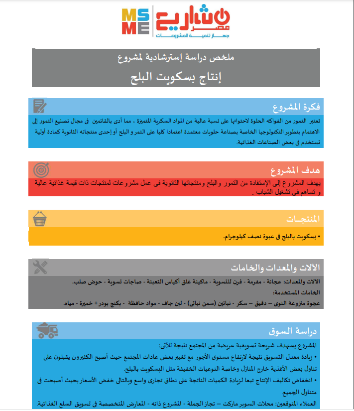 ومن ضمن تلك الأفكار التي يقدمها الجهاز، ملخص دراسة جدوى استرشادية لمشروع إنتاج بسكويت البلح.