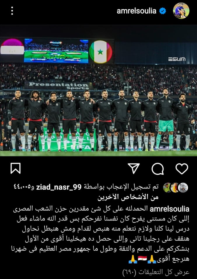 اعتذر عمرو السولية لاعب منتخب مصر والنادي الأهلي على موقع التواصل الاجتماعي (إنستجرام) للجماهير بعد الهزيمة من منتخب السنغال بضربات الترجيح في إياب التصفيات النهائية المؤهلة لكأس العالم.