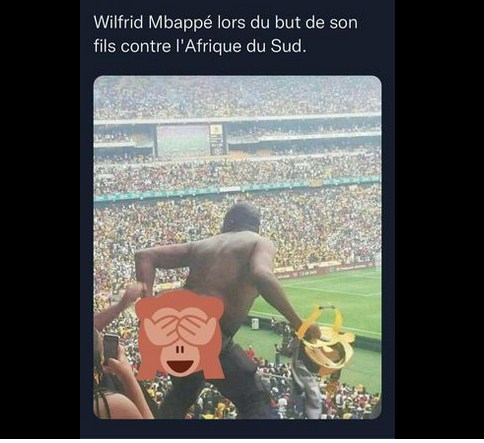 لكن ما أزعج مبابي تعليق الصورة الذي جاء فيه: "ويلفريد مبابي خلال احتفاله بهدف نجله (كيليان) ضد جنوب أفريقيا".