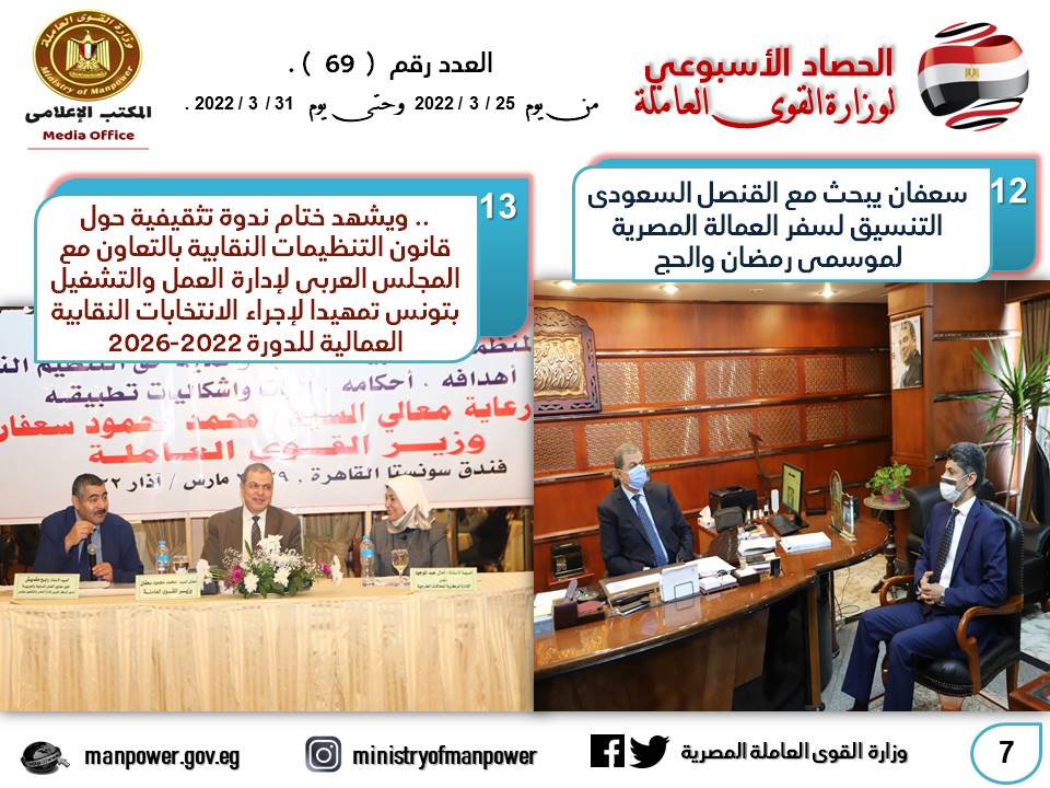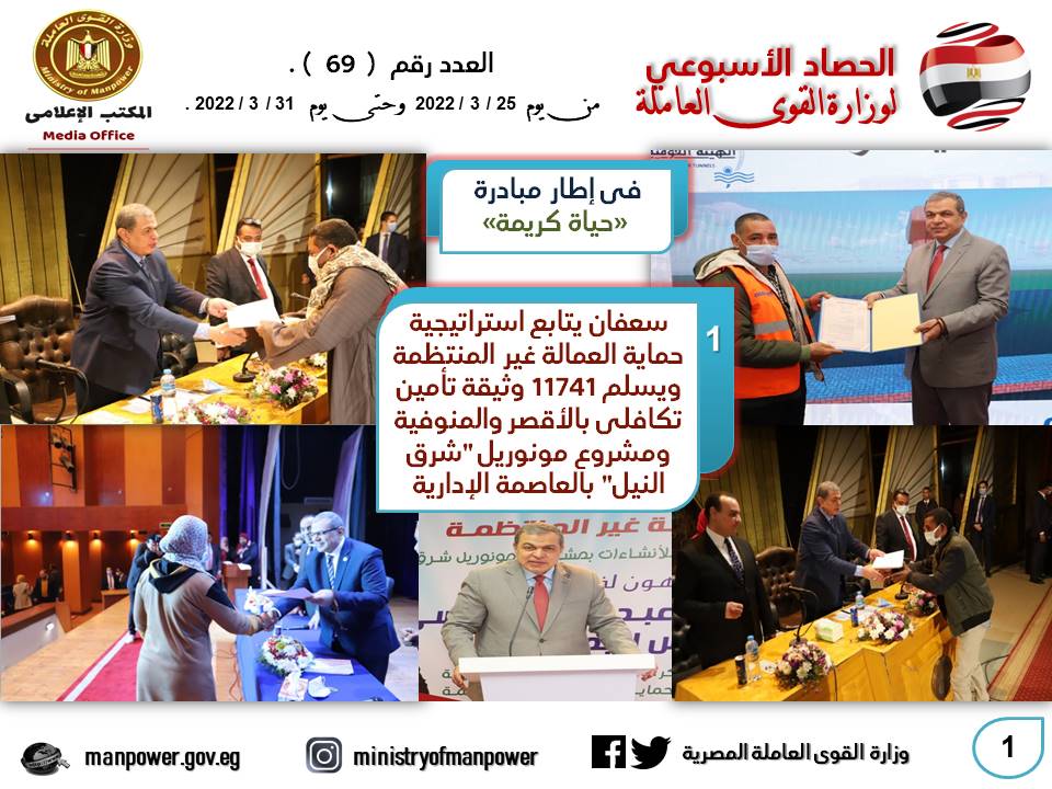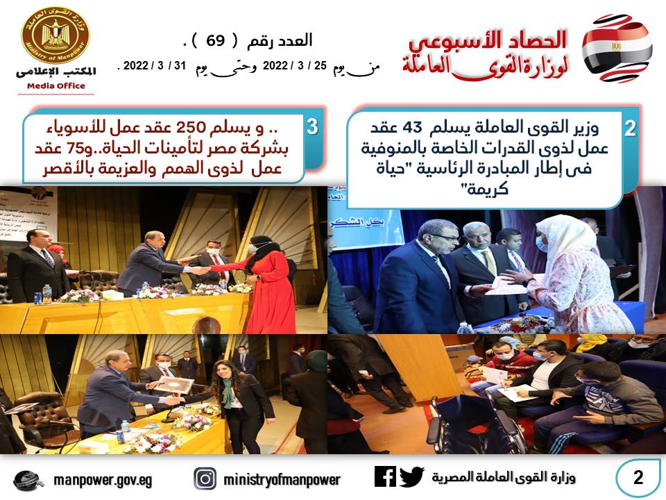 شهد حصاد الأسبوع الحالي، في وزارة القوى العاملة العديد من الأحداث المهمة خلال الفترة من 25 إلى 31 مارس 2022- حيث تابع وزير القوى العاملة استراتيجية حماية العمالة غير المنتظمة بالمحافظات وسلم 11741 وثيقة تأمين تكافلي بالأقصر والمنوفية ومشروع مونوريل العاصمة الإدارية الجديدة، كما سلم 118 عقد عمل لذوي القدرات بالأقصر والمنوفية، وشهد حفل زفاف جماعي بالأقصر، وتفقد مشروع مونوريل العاصمة الإدارية الجديدة، وبحث مع القنصل السعودي التنسيق لسفر العمالة المصرية لموسمي رمضان والحج، وتعيين 7 آلاف و290 شابًا منهم 169 "قادرون باختلاف" في 7 محافظات، وتحويل 905 آلاف جنيه مستحقات العمالة المغادرة للأردن.
