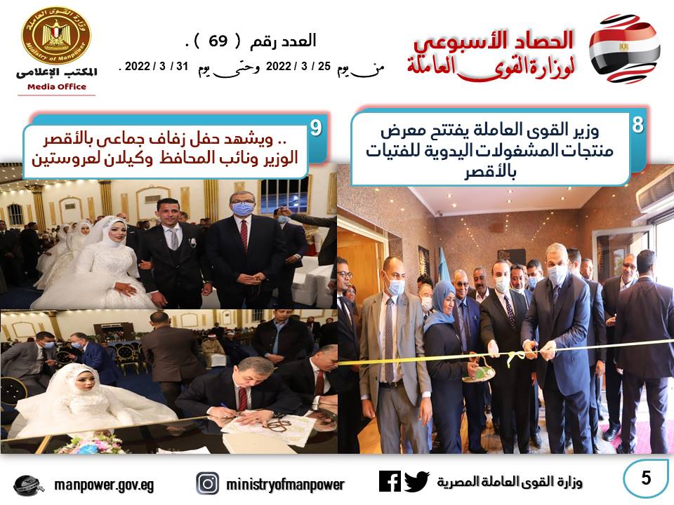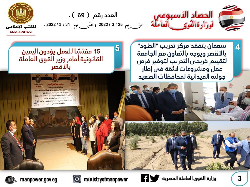 وفيما يلي تفاصيل ما جاء بالحصاد الأسبوعي، حيث امتدت جولة وزير القوى العاملة محمد سعفان في إطار جولاته الميدانية لمحافظات الصعيد من محافظة قنا إلي الأقصر ليشهد الوزير ونائب المحافظ الدكتور محمد عبد القادر خيري، والدكتور محمد محجوب عزوز رئيس جامعة الأقصر، والنائب محمد عطا نائب مجلس الشيوخ، والنائب محمد خليل العماري عضو مجلس النواب فعاليات مبادرة "فرحة عمرى" التى نظمتها مديرية القوى العاملة بالمحافظة لتتواكب مع الاهتمام الخاص للرئيس عبدالفتاح السيسى برعاية الشباب وتمكينهم بإطلاق العديد من الإجراءات والبرامج الاجتماعية وغيرها التى تسهم في إحداث التنمية البشرية المطلوبة فضلا عن المبادرة الرئاسية "حياة كريمة" لدعم الفئات المجتمعية الأكثر احتياجًا وذوى القدرات الخاصة والأرامل والمطلقات ودمجهم فى المجتمع.
