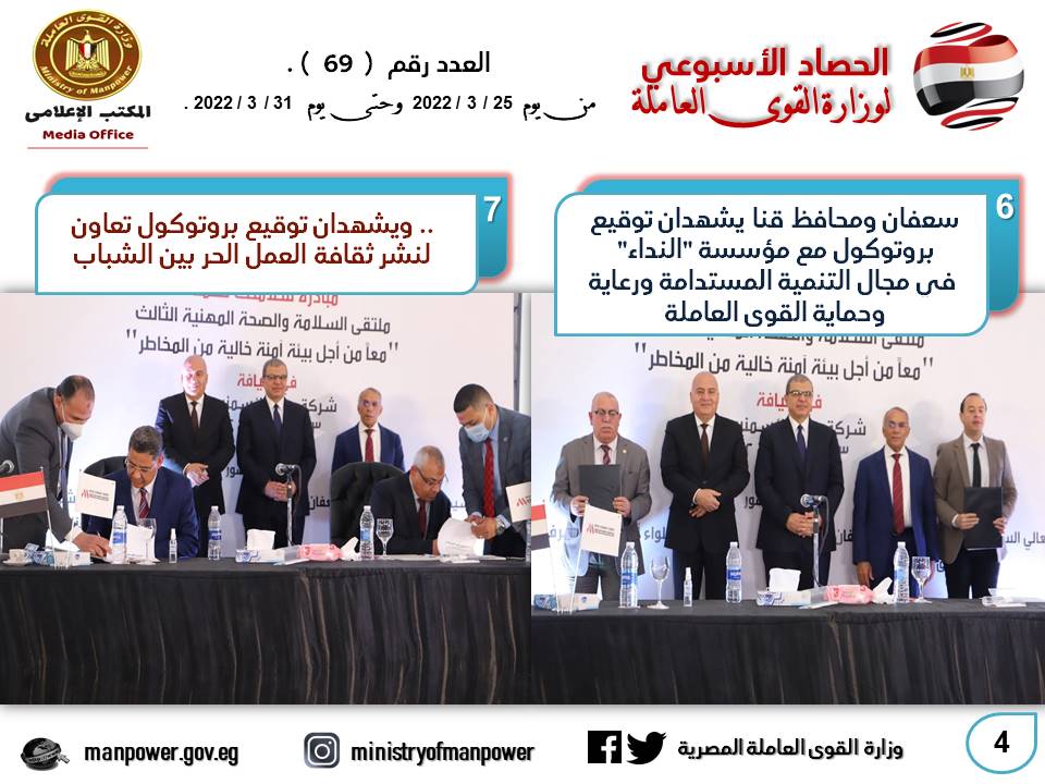 وشهد وزير القوى العاملة، ومحافظ قنا اللواء أشرف الداودي، واللواء عبد الفتاح حرحور رئيس شركة مصر للأسمنت قنا، مراسم التوقيع على بروتوكول تعاون بين الوزارة والمؤسسة المصرية للتنمية المتكاملة "النداء" في مجال التنمية المستدامة ورعاية وحماية القوى العاملة، وذلك بحضور وحسام طلبة، وعبدة هاشم، ومحمد عبد الوهاب مديرو مديريات القوي العاملة بقنا الأقصر وأسوان، وسيد حامد رئيس الاتحاد المحلى لعمال قنا والأقصر.