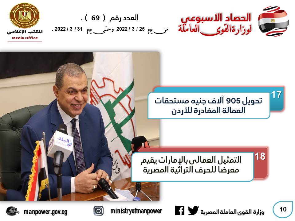 وامتد الحصاد ليشمل نجاح مكتب التمثيل العمالي التابع للوزارة بالسفارة المصرية بعمان-الأردن، بالمتابعة اللحظية والجهود المبذولة والمقابلات مع المسئولين بمؤسسة الضمان الاجتماعي بالأردن، واستكمالا لما تم تحويله سابقا، تم تحويل القائمة الـ 74 من مستحقات الضمان الاجتماعي لنحو 40 عامل مصري لدى المؤسسة غادروا عمان نهائيا.