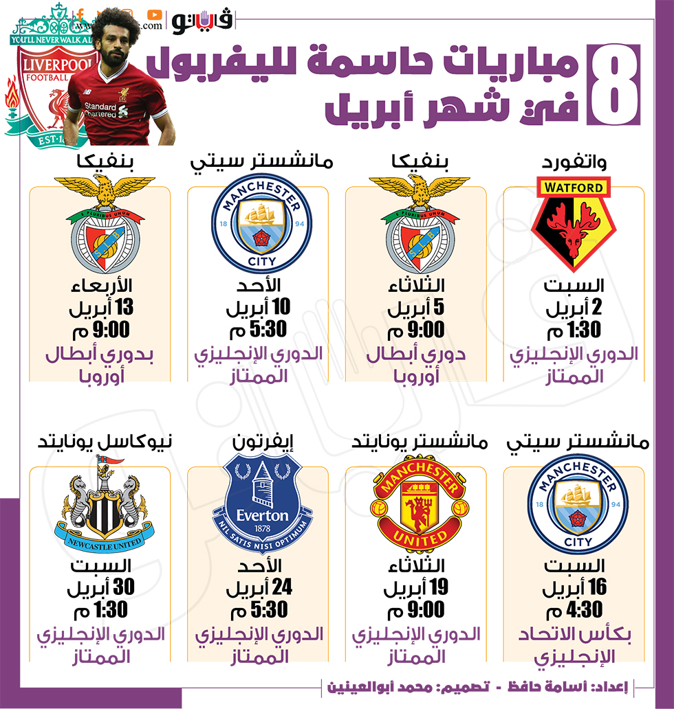 8 مباريات حاسمة لليفربول في شهر أبريل|إنفوجراف الجمعة 01/أبريل/2022 - 04:05 م 4/1/2022 4:05:49 PM ليفربول اسامة حافظ شارك طباعة 18 حجم الخط شارك طباعة الدوري الانجليزي ليفربول دوري ابطال اوروبا ليفربول مع مانشستر يونايتد