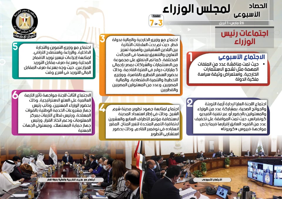 وعلى صعيد الاجتماعات التي عقدها الدكتور مصطفى مدبولي رئيس مجلس الوزراء، أوضح التقرير أنه تم عقد اجتماع اللجنة العليا لإدارة أزمة الأوبئة والجوائح الصحية، بمشاركة عدد من الوزراء والمسئولين بالحضور أو عبر تقنية الفيديو كونفرانس، حيث تمت الموافقة على تخفيف عدد من القيود السابق إقرارها فيما يخص مواجهة فيروس "كورونا"، بالإضافة إلى عقد الاجتماع الثالث للجنة مواجهة تأثير الأزمة العالمية على السلع الاستراتيجية.