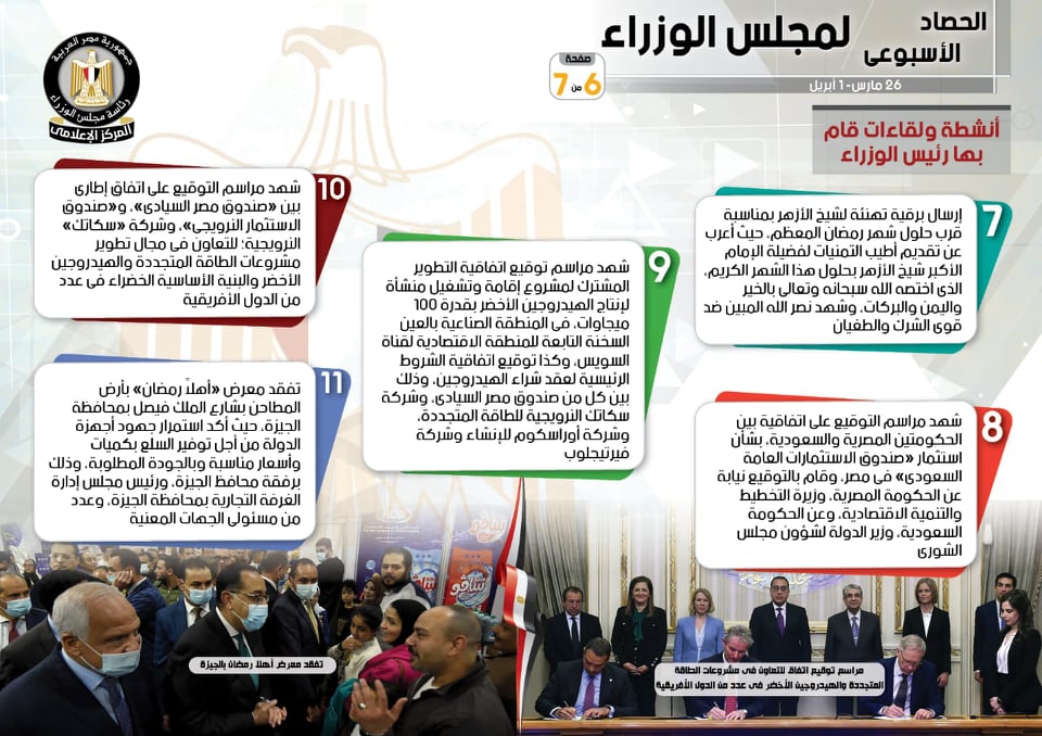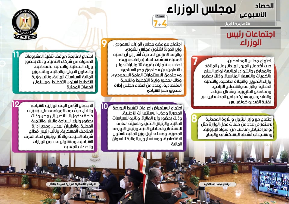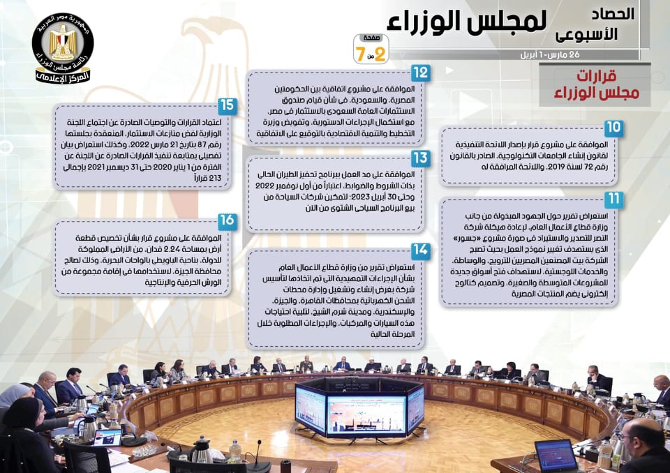 نشر المركز الإعلامي لمجلس الوزراء، تقريرًا شمل إنفوجرافات سلط من خلالها الضوء على الحصاد الأسبوعي لمجلس الوزراء، وذلك خلال الفترة من 26 مارس حتى 1 أبريل 2022، والذي تضمن الموافقة على عدد من القرارات، فضلًا عن الاجتماعات واللقاءات التي عقدها الدكتور مصطفى مدبولي، رئيس مجلس الوزراء، بالإضافة إلى ما قام به من أنشطة.