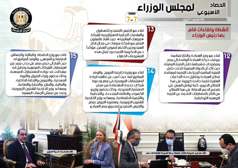 أما بشأن اللقاءات التي عقدها الدكتور مصطفى مدبولي رئيس مجلس الوزراء على مدار الأسبوع، أظهر التقرير، لقاء مع وزير السياحة والآثار لمتابعة موقف حركة السياحة الوافدة إلى مصر، ومقترحات تنشيطها خلال الفترة المقبلة، حيث أكد أن الدولة المصرية اتخذت خلال الفترة الماضية الإجراءات اللازمة لمساندة قطاع السياحة وتقليل حدة التداعيات السلبية لأزمة جائحة كورونا على هذا القطاع الحيوي، كما تواصل العمل على تقديم الدعم للحفاظ على هذا القطاع من التأثر بالاضطرابات الناجمة عن الأزمة الروسية الأوكرانية، بالإضافة إلى لقاء مع الرئيس التنفيذي للأسطول والعلامات التجارية الاستراتيجية لشركة "ميرسك العالمية"، حيث أشاد بالتعاون المقرر مع شركة ميرسك في مجال إنتاج الهيدروجين الأخضر لتموين السفن، مؤكدًا دعم الحكومة اللامحدود لمثل هذه المشروعات الخضراء.