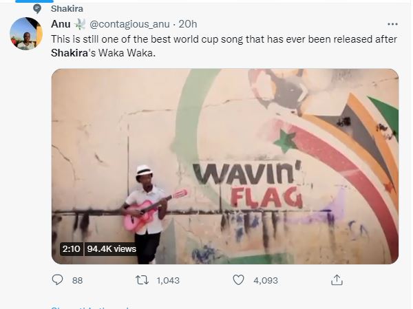 واسترجع مستخدمي مواقع التواصل الاجتماعي أغنية “واكا واكا”، التي غنتها شاكيرا في حفل افتتاح كأس العالم 2010 الذي أقيم في جنوب أفريقيا، مؤكدين علي أنها كانت الأفضل بين جميع أغاني كأس العالم.
