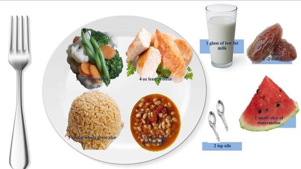 وعن الطعام الرمضاني الصحي لمريض السكر فقال أسامة حمدي "رابعًا: الطبق الرمضاني الصحي في الافطار.. اسهل الطرق لاختيار الافطار الصحي في رمضان هو تقسيم الطبق الي أربعة أقسام متساوية.. الربع الاول يحتوي علي البروتينات الحيوانية كالدجاج او اللحم او السمك. الربع الثاني علي البروتينات النباتية كالبقوليات المطبوخة كاللوبيا او الفاصوليا الجافة أو الفول او العدس او الخضراوات المطبوخة كالبامية او الفاصوليا الخضراء او البازلاء او الكوسة او الجزر او السبانخ او الملوخية. الربع الثالث للسلاطة الخضراء من الخس والخيار والطماطم والجرجير مع معلقتين صغيرتين من زيت الزيتون. الربع الرابع للنشويات ٣ـ٤ ملاعق من الرز (يجب غسل الأرز عدة مرات لتقليل النشويات) او ربع رغيف من الخبز الأسمر"
