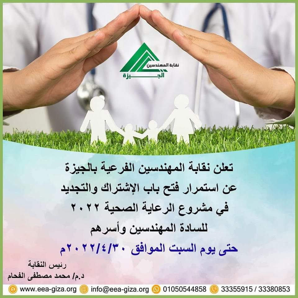 وقالت نقابة المهندسين الفرعية بالجيزة، في منشور لها أنه تم مد فترة الاشتراك بمشروع الرعاية الصحة للمهندسين حتى 30 أبريل لعام 2022.