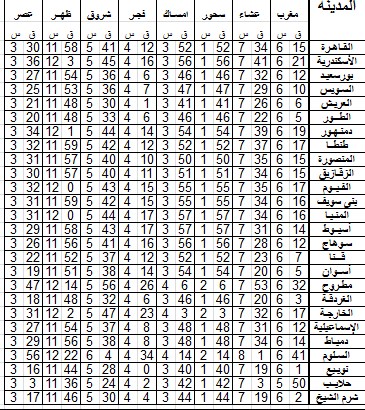 مواقيت الصلاة اليوم الإثنين وفقا للتوقيت المحلي لمدينتي القاهرة والإسكندرية وعدد من مدن ومحافظات الجمهورية: