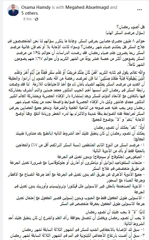 وكتب الدكتور أسامة حمدي تدوينة على الفيس بوك "حوالي ٨ مليون مصري مصابين بمرض السكر. وعادة ما يتكرر سؤالهم لنا نحن المتخصصون في علاج السكر هل يمكنني صيام شهر رمضان؟ وسواء كانت الإجابة بلا أو نعم فإن غالبية مرضى السكر ربما يصرون على صيام رمضان. فقد رصدت الدراسات أن حوالي ٩٤٪ من مرضى السكر يصومون أكثر من خمسة عشر يومًا من الشهر الكريم وأن حوالي ٦٧٪ منهم يصومون الشهر كاملًا."