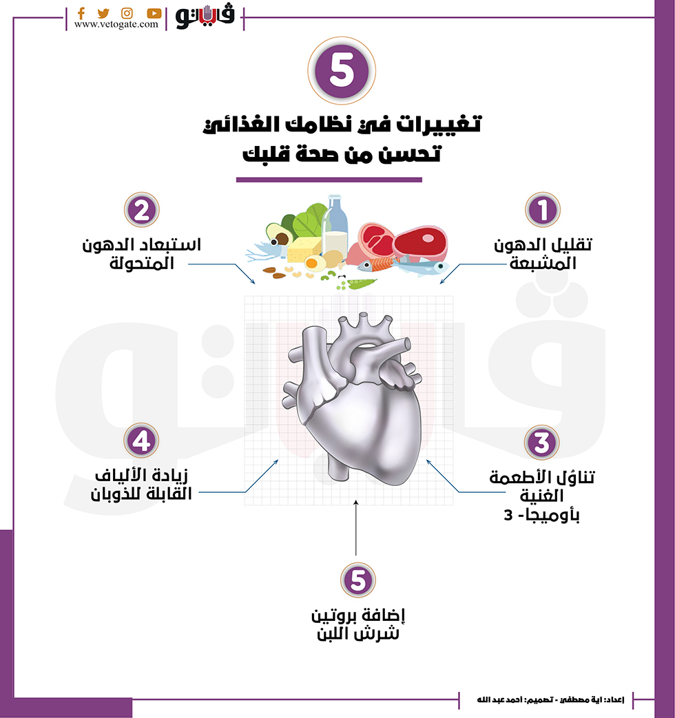 5 تغييرات في نظامك الغذائي تحسن من صحة قلبك | انفوجراف الثلاثاء 05/أبريل/2022 - 12:29 م 4/5/2022 12:29:11 PM نظام غذائي صحي آية مصطفى شارك طباعة 18 حجم الخط شارك طباعة الدهون المشبعة نظامك الغذائي الكوليسترول الدهون المتحولة انفوجراف الدهون