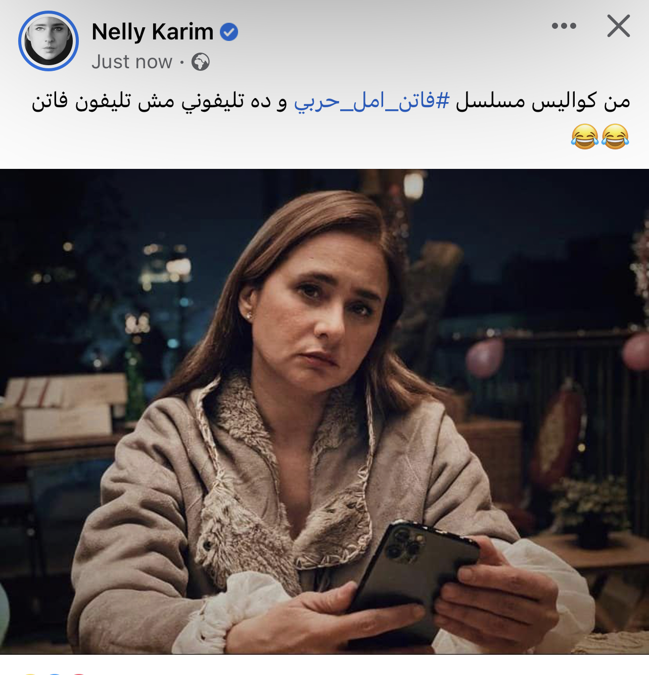 نشرت الممثلة نيللي كريم صورة جديدة من كواليس مسلسلها فاتن أمل حربي الذي تنافس به في السباق الرمضاني، وظهرت فيها وهي ترتدي ملابس نوم شتوية وتمسك بهاتف محمول أحدث نوع لتعلق عليها ساخرة" من كواليس المسلسل وده تليفوني مش تليفون فاتن".